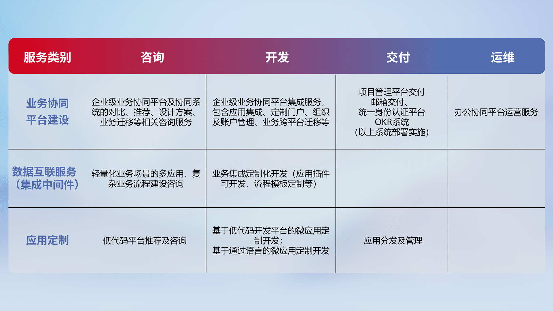 针对钉钉、、、企微、、、、IDaas等平台级产品提供产品的规划、、、方案、、交付、、、、定制化开发等服务,,,实现如统一协同办公、、、、智能客户服务、、混合会议管理、、、、智能数据查询、、、等业务场景,,,实现数字化转型。。