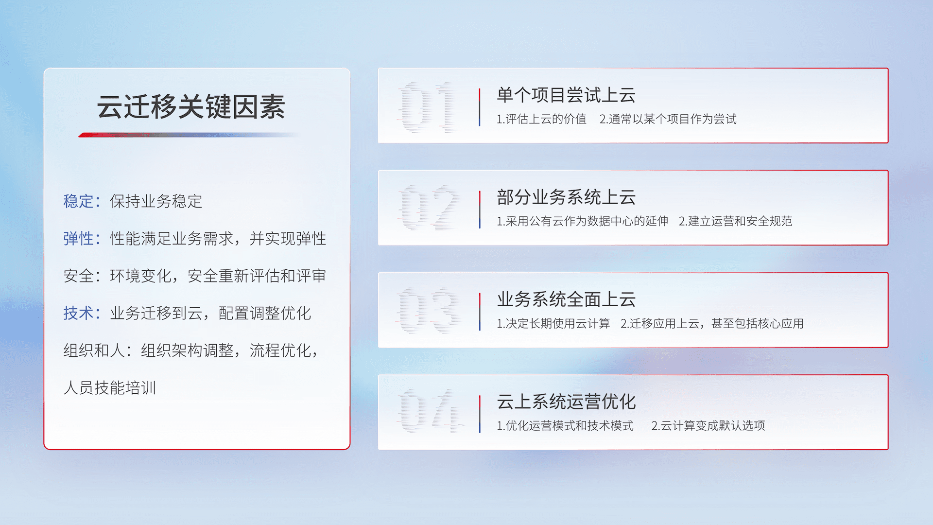 结合实际业务,,,,从规划设计、、、、云平台选型、、云原生改造、、、数据迁移、、集成交付,,,,迁移全过程为客户识别最佳上云路径,,,做好风险识别管理,,设计网络架构、、、身份权限、、、、安全审计合规、、操作审计、、、日志审计、、监控告警策略、、多站点容灾设计等,,,对云上基础设施进行整体规划,,,提升IT治理水平,,,以满足弹性、、、、高可用、、、、高性能的需求。。。。