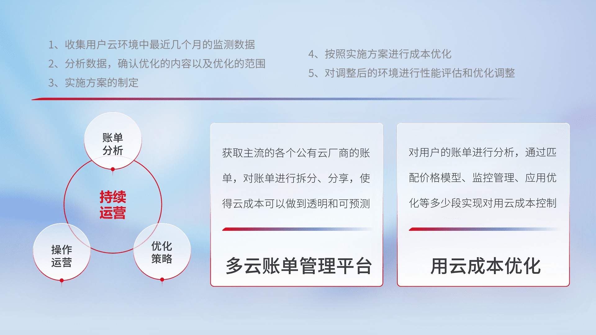 通过多云纳管,,,以统一的资源数据模型把客户的云资源进行抽象和封装,,进而实现对多云资源的统一操作,,,,保障云资源管理的可靠性、、稳定性与可用性。。。。量身定制化运维内容,,配置、、开发运维、、、补丁管理、、、、备份、、监控、、、认证和访问管理、、审计和日常巡检等,,,,保障在用云过程中的可靠度,,稳定度以及高可用率。。。