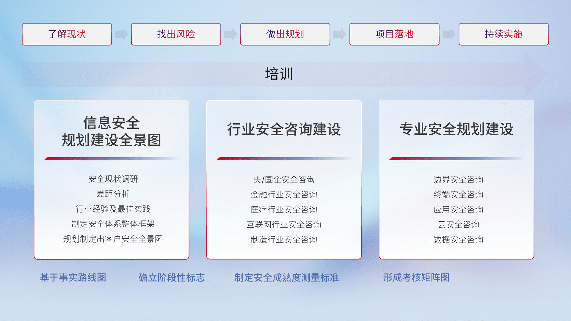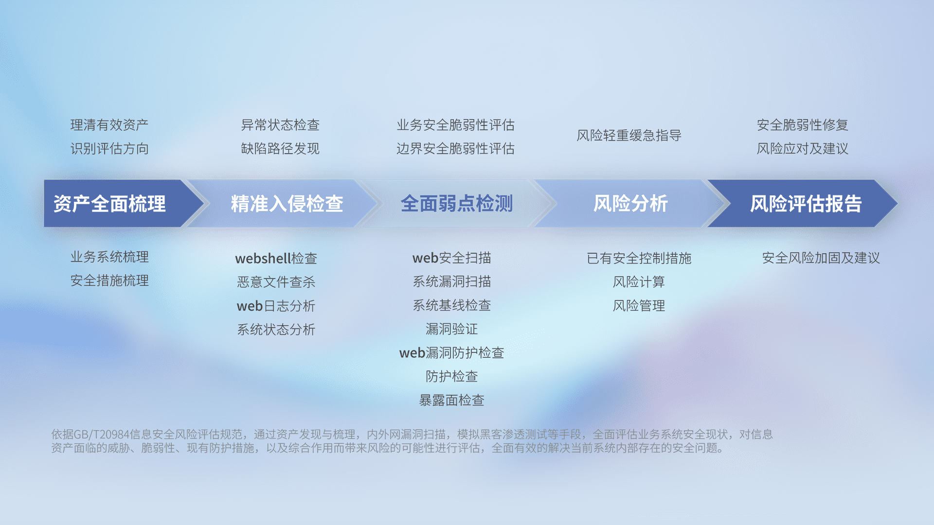 针对客户行业特性,,以专业的安全服务+多厂商联合解决方案提供专属的一站式安全管理服务,,,帮助客户全面感知网络空间威胁,,,基于识别、、、、检测、、、、分析、、、、防护、、、监测、、、、响应的服务理论模型,,,,从方案咨询、、、集成交付、、、评估验证、、、优化加固、、、运维运营,,,致力于为客户提供完整的闭环管理式安全服务。。以实战经验为客户打造高抵御风险的安全体系,,帮助客户发现威胁、、、、对抗威胁、、、处置威胁,,不断积累安全对抗能力,,,,持续保障数字化安全。。。